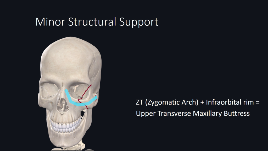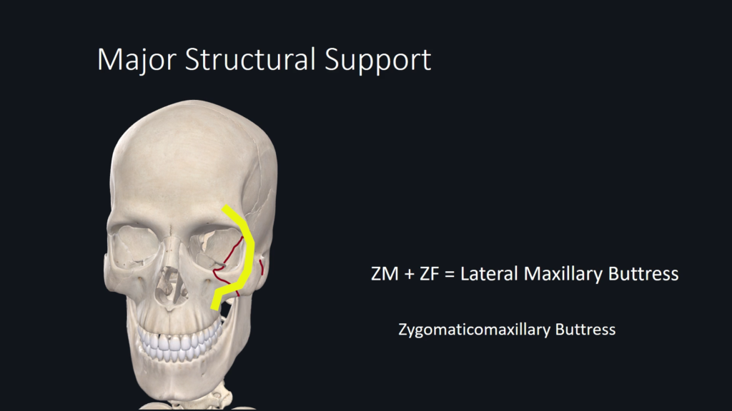 Zygomaticomaxillary Buttress is a vertically-oriented major structural support to midface and upper face. This support must be restored during surgical repair.