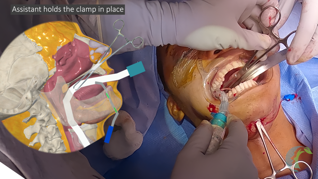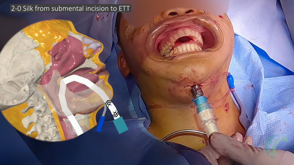 - Securing the Tube: After successfully passing the tube through the floor of the mouth and the submental incision, reattach the previously modified adapter. Secure the tube using sutures.