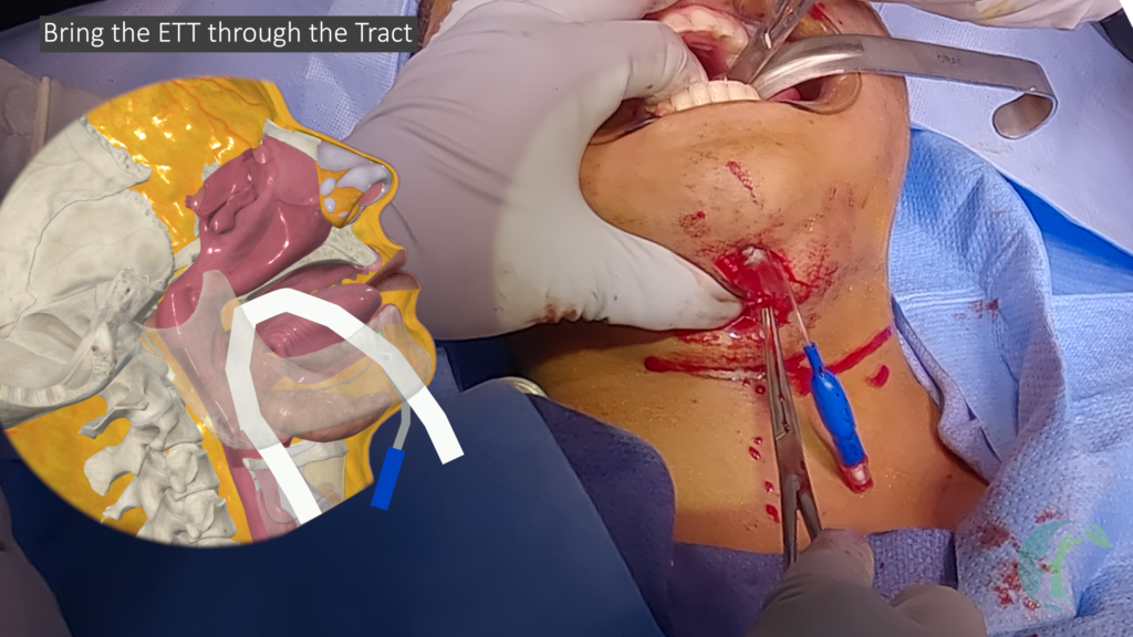 Once the procedure is complete, the tube can be safely tunneled back through the mouth, enabling the successful extubation of the patient. Intraoral and skin incisions are closed with sutures.