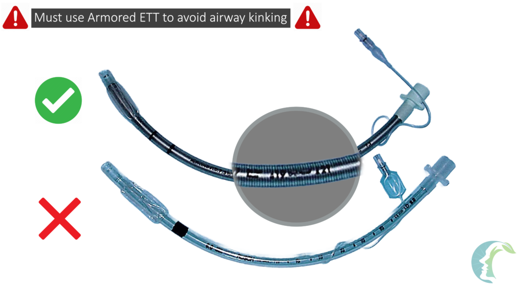- Preparation of the Armored Tube: If the adapter of the armored endotracheal tube does not detach easily, cut the adapter to facilitate reattachment later. This modification ensures the ETT will fit through the soft tissue tunnel.