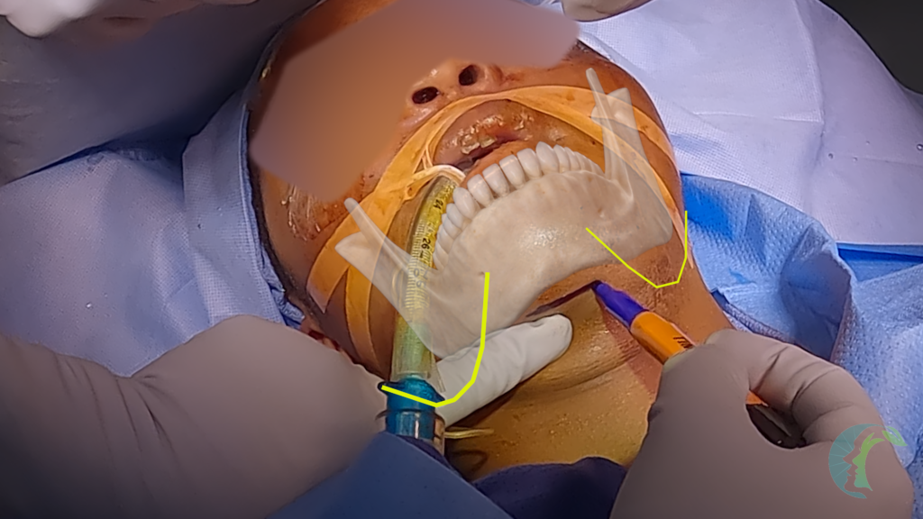 - Skin Incision Technique: Mark a 2-2.5 cm midline skin incision in the submental region, just posterior to the central mandible. Make the incision through the skin and subcutaneous tissue, moving down to the mandible. Use digital palpation to verify the midline position and avoid injury to the marginal mandibular nerve.