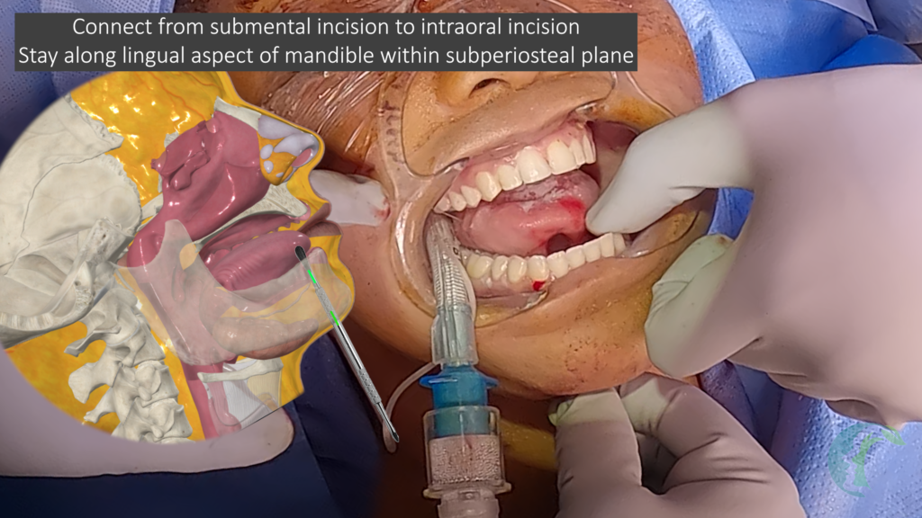 - Widening the Incision: Once you reach the bone, use #9 elevator to identify subperiosteal tissue plane along the lingual aspect of the central mandible. Connect from the inferior neck skin to intraoral incision. Next, widen the tract with a blunt-tip instrument. This creates adequate space for the endotracheal tube to pass through.