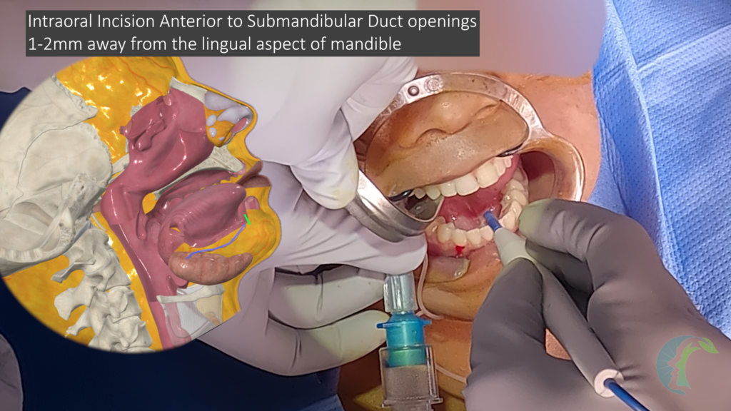 - Mucosal Incision: After successful intubation, identify the midline of the patient’s mandible. Locate the submandibular duct openings along the midline floor of the mouth. Make a mucosal incision anterior to the submandibular ducts along the lingual aspect of the midline mandible. Ideally, leave around 1 mm of mucosal cuff along the lingual mandible for closure.