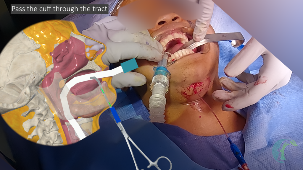 - Securing the Tube: After successfully passing the tube through the floor of the mouth and the submental incision, reattach the previously modified adapter. Secure the tube using sutures.