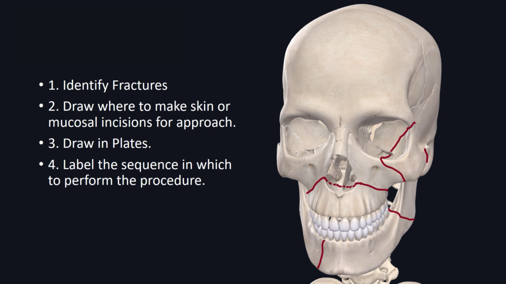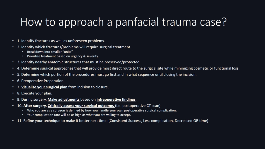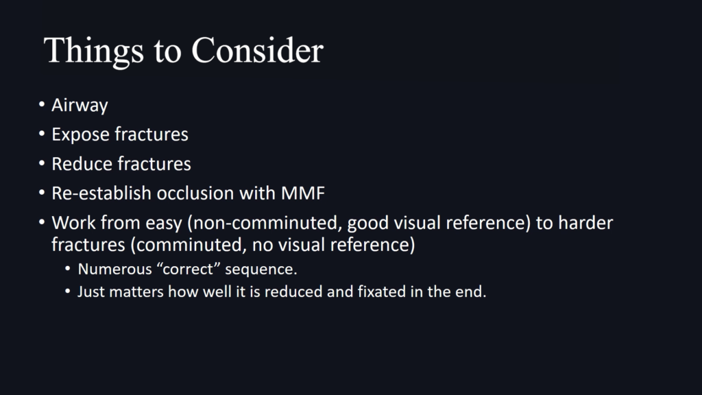 Discuss concepts behind a panfacial trauma case example that involves concurrent Bilateral Le Fort 1, ZMC, Mandibular PS and Angle fractures.