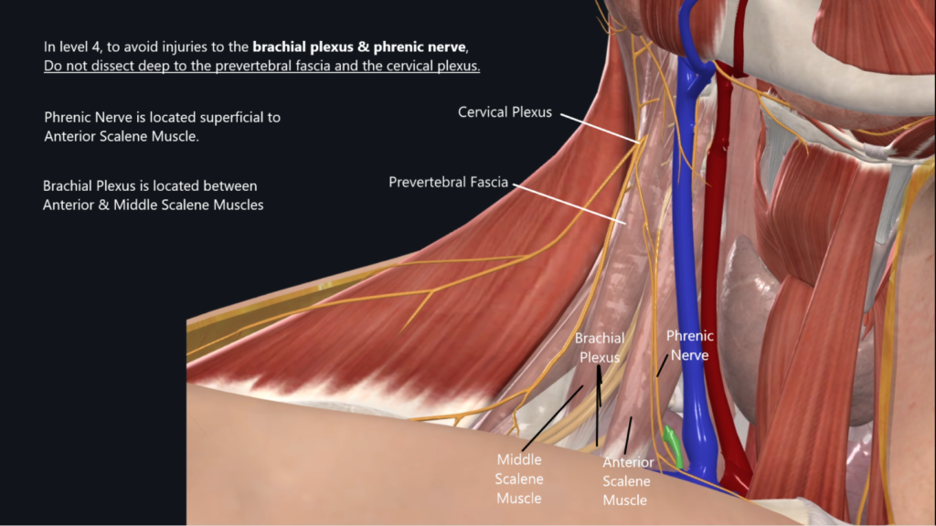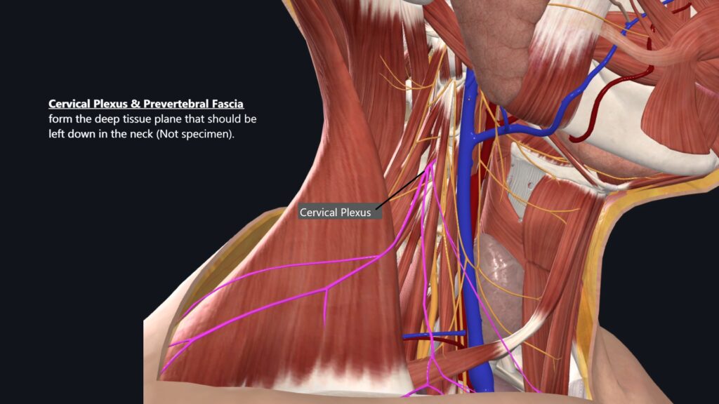 - Identify Prevertebral Fascia: Surrounds the neck muscles and cervical plexus. Do not dissect deeper than this structure to protect brachial plexus & phrenic nerve. Typically, sensory nerve rootlets also serve as deep tissue plane boundary along with prevertebral fascia.