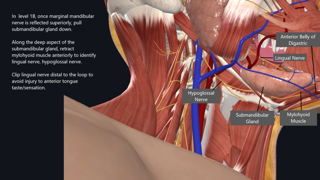 - Lingual Nerve: Looping down towards the submandibular gland; Disconnect the nerve away from the loop to ensure the sensory tongue innervation is intact while disconnecting it from the gland.