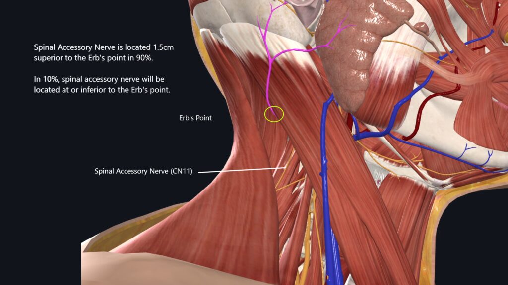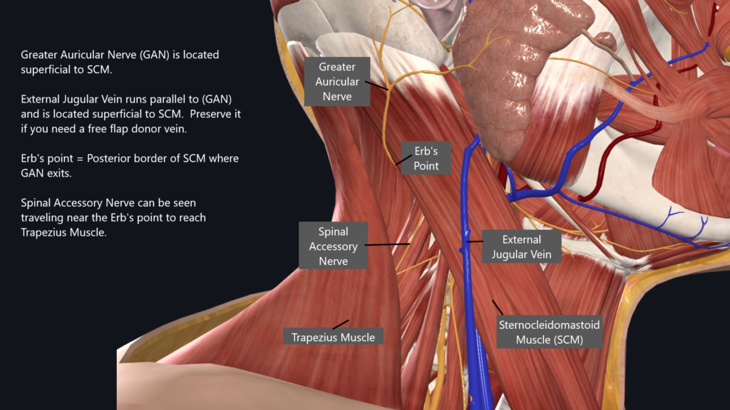 - Great auricular nerve runs parallel to the external jugular vein. Erb’s point is at the posterior border of SCM where the greater auricular nerve exists and runs superficial to SCM. Spinal accessory nerve (CN11) can be identified near Erb’s point as it travels towards the trapezius muscle.
