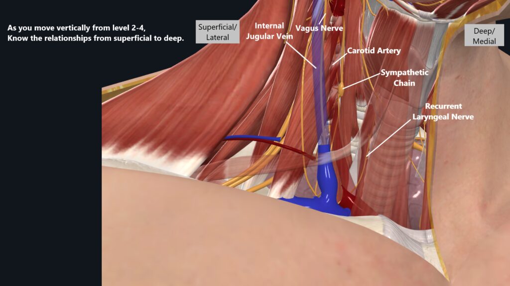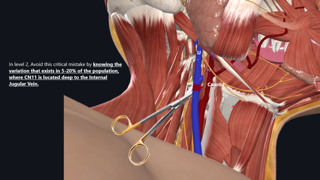 - Locate Internal Jugular Vein: Start your dissection deep to the sternocleidomastoid and digastric muscles. Once IJV is identified, you can move vertically between level 2 to 4 by following IJV.