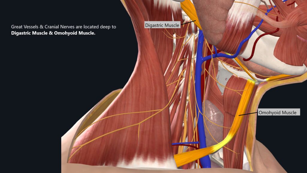 - Deep Structures: Including major vessels and nerves. Key critical structures that need to be preserved will be located deep to digastric & omohyoid muscles.