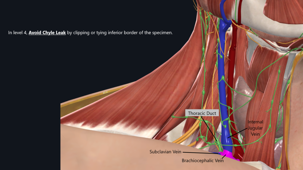 - Be vigilant for the thoracic duct’s location during dissection; a chylothorax can occur if this structure is inadvertently injured. Consider performing the Valsalva maneuver after dissection to assess for any lymphatic leakage. You can be chyle leaks in bilateral neck, although left side is traditionally more likely where it will occur.
